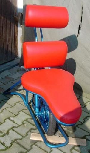 Auch hier ein Beispiel für ein schönes Designermöbel das in unserer Werkstatt individuell für einen Kunden gepolstert und bezogen wurde. Hierbei handelt es sich um ein altes Motorradteil. Die vordere Gabel wurde umgebaut, daß man bequem darauf sitzen kann. Der Bezug ist Mercedes Benz Autoleder in Knallrot